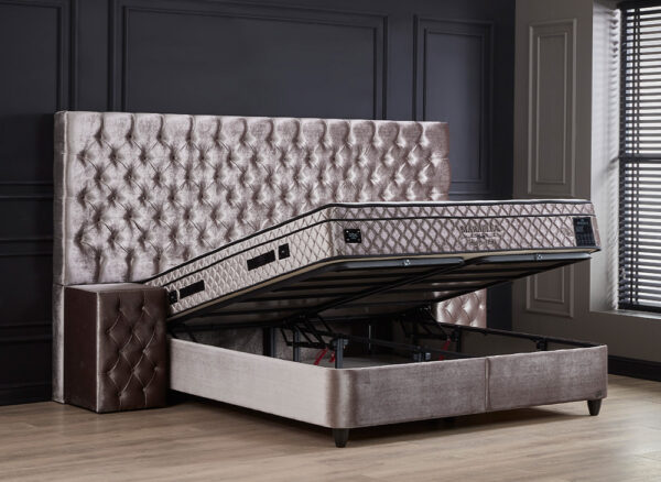 Het gestoffeerde opbergbed Marbella bestaat uit een gecapitonneerd hoofdbord met een zeer sfeervolle afwerking
