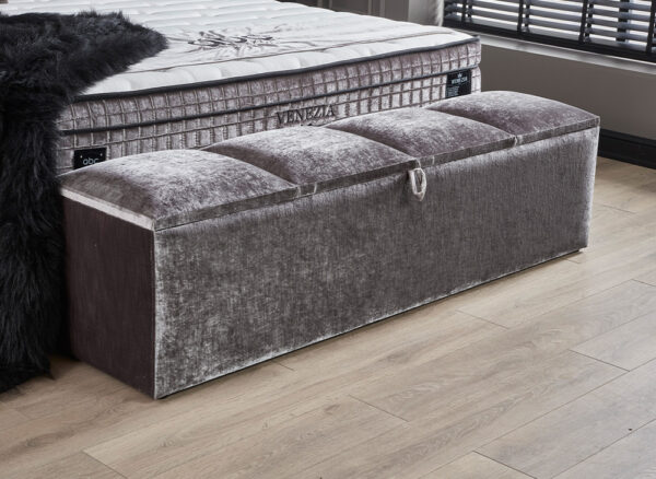 Weer een fraaie Opberg boxspring in onze collectie! Dit betreft een modern kolossaal en elegante boxspring combinatie met opbergruimte, uitgevoerd in een mooi blok design. Het meegeleverde hoofdbord heeft een patroon met meerdere vakken. De kleur is zilver grijs met een velours vleug.